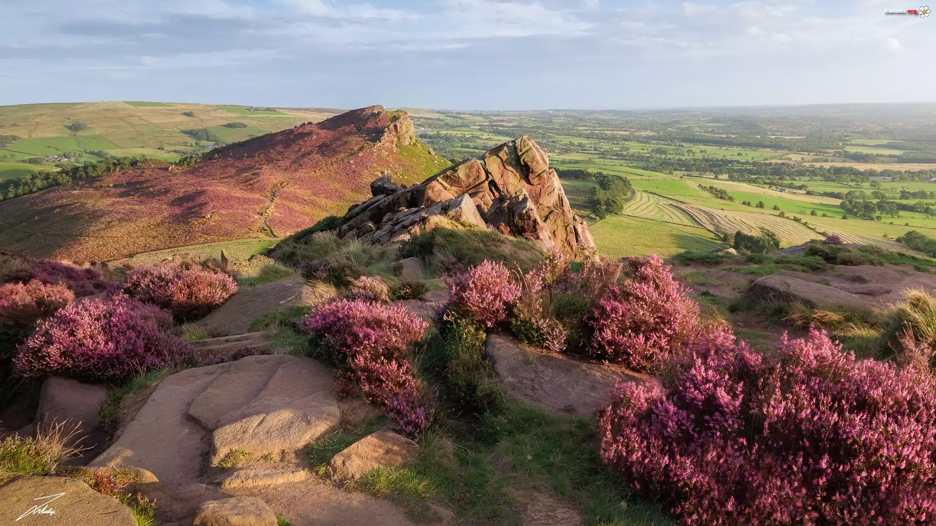 Kwiat Wysokie, Skały, Wrzosy, Pola, Łąki, Drzewa, Park Narodowy Peak District, Anglia