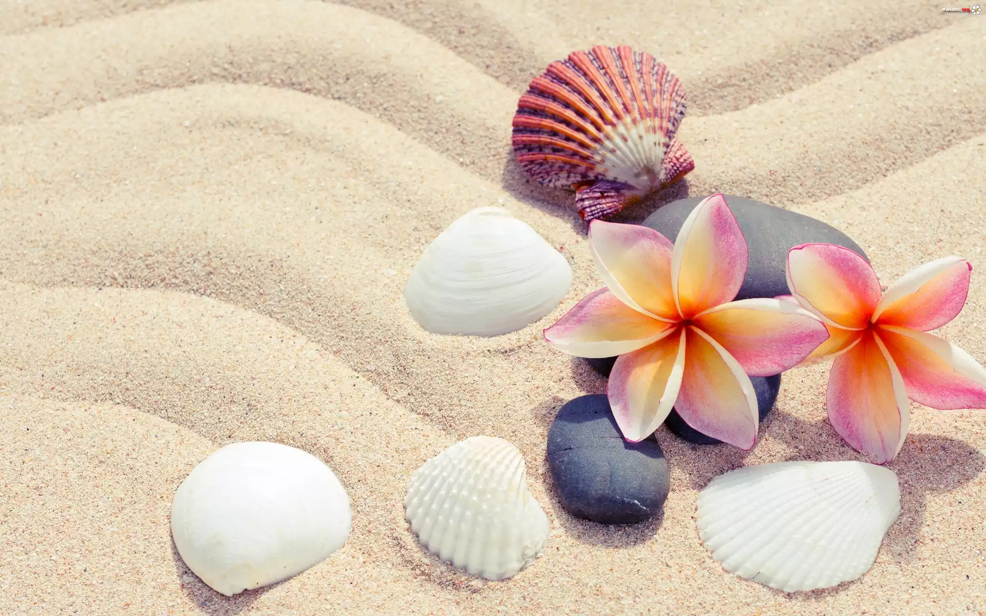 Piasek, Muszelki, Kamienie, Kwiaty, Plumeria - Zdjęcia
