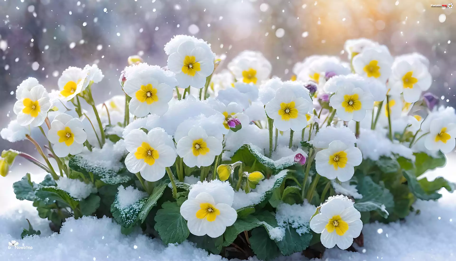 Białe, Pierwiosnki, Kwiaty, Śnieg, Grafika - Zdjęcia
