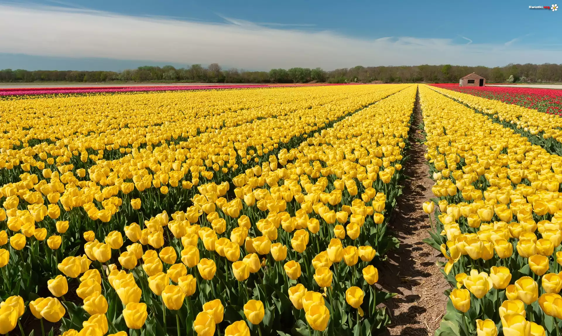 Kwiat Pole, Plantacja, Żółte, Tulipany, Drzewa