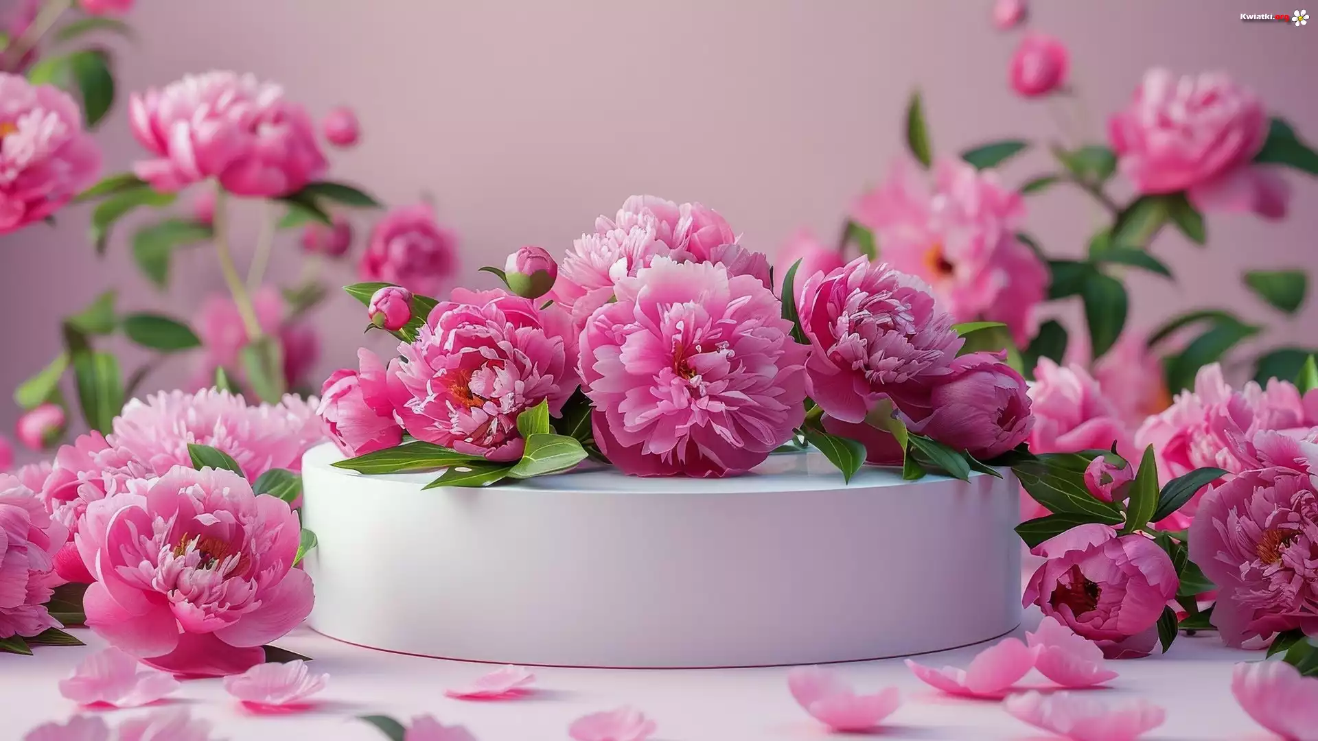 Różowe, Piwonie, Okrągła, Płaska, Biała, Podstawka - Zdjęcia