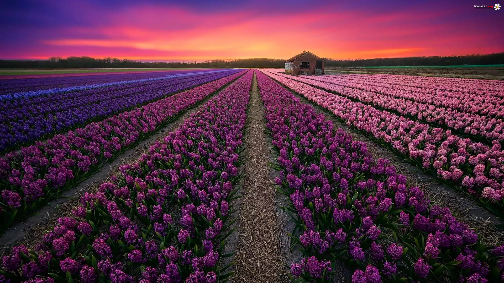 Holandia, Pola, Kwiaty, Hiacynty, Zachód Słońca, Domek - Zdjęcia