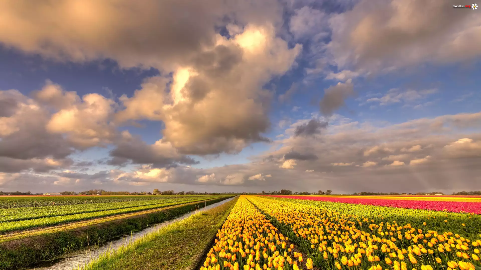 Chmury, Plantacja, Kwiaty, Tulipany, Rzeka, Pola Farmy i pola - Zdjęcia