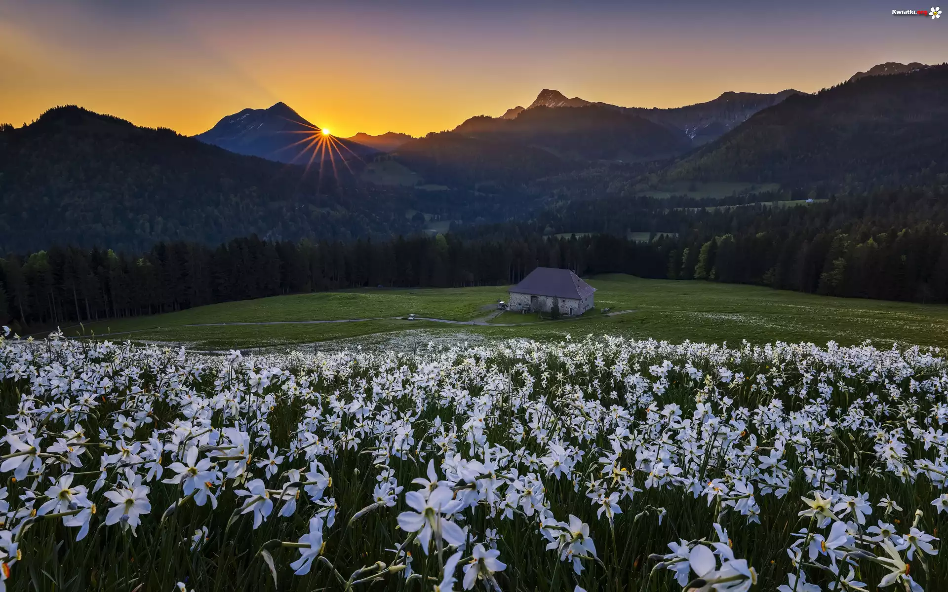 Pole, Kwiaty, Góry, Dom, Narcyzy, Drzewa, Las, Zachód słońca - Zdjęcia