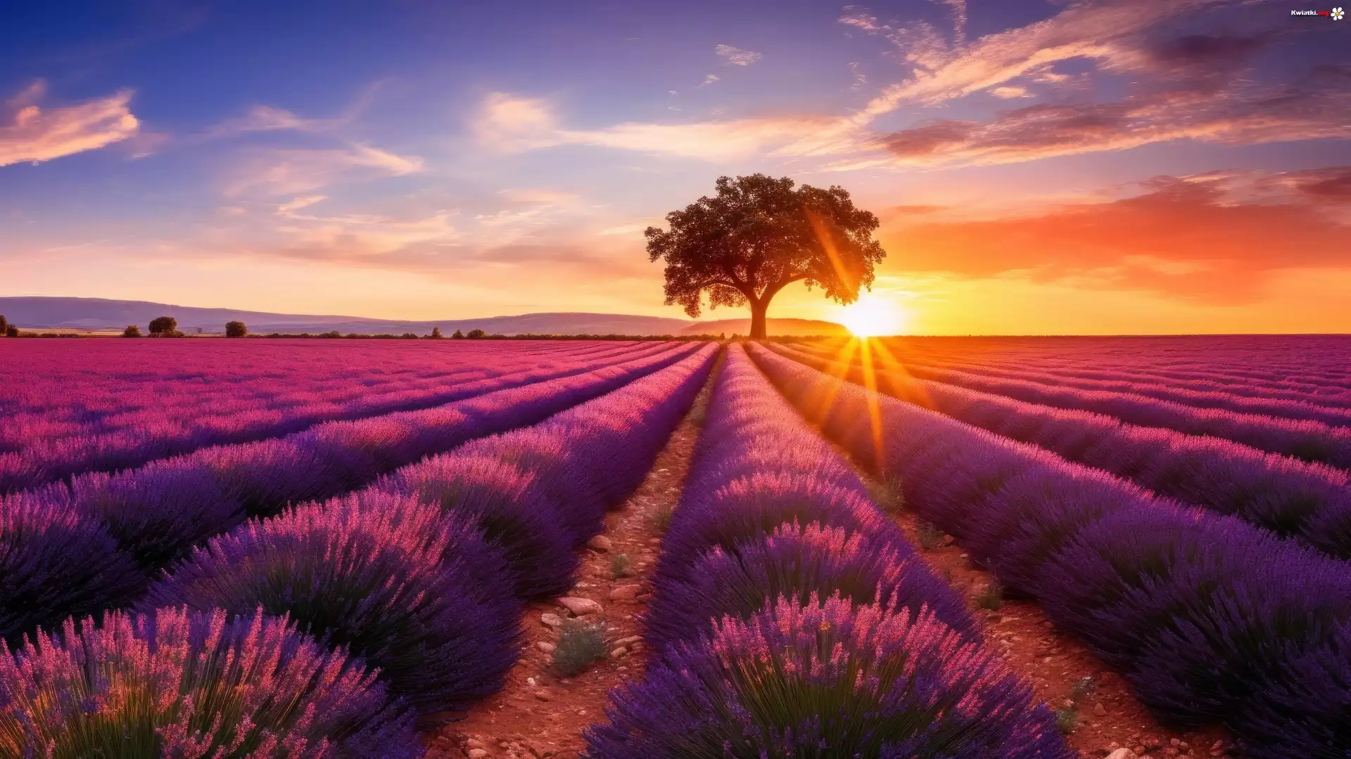 Pole, Lawenda, Drzewo, Wzgórza, Niebo, Promienie słońca, Lato, 2D - Zdjęcia