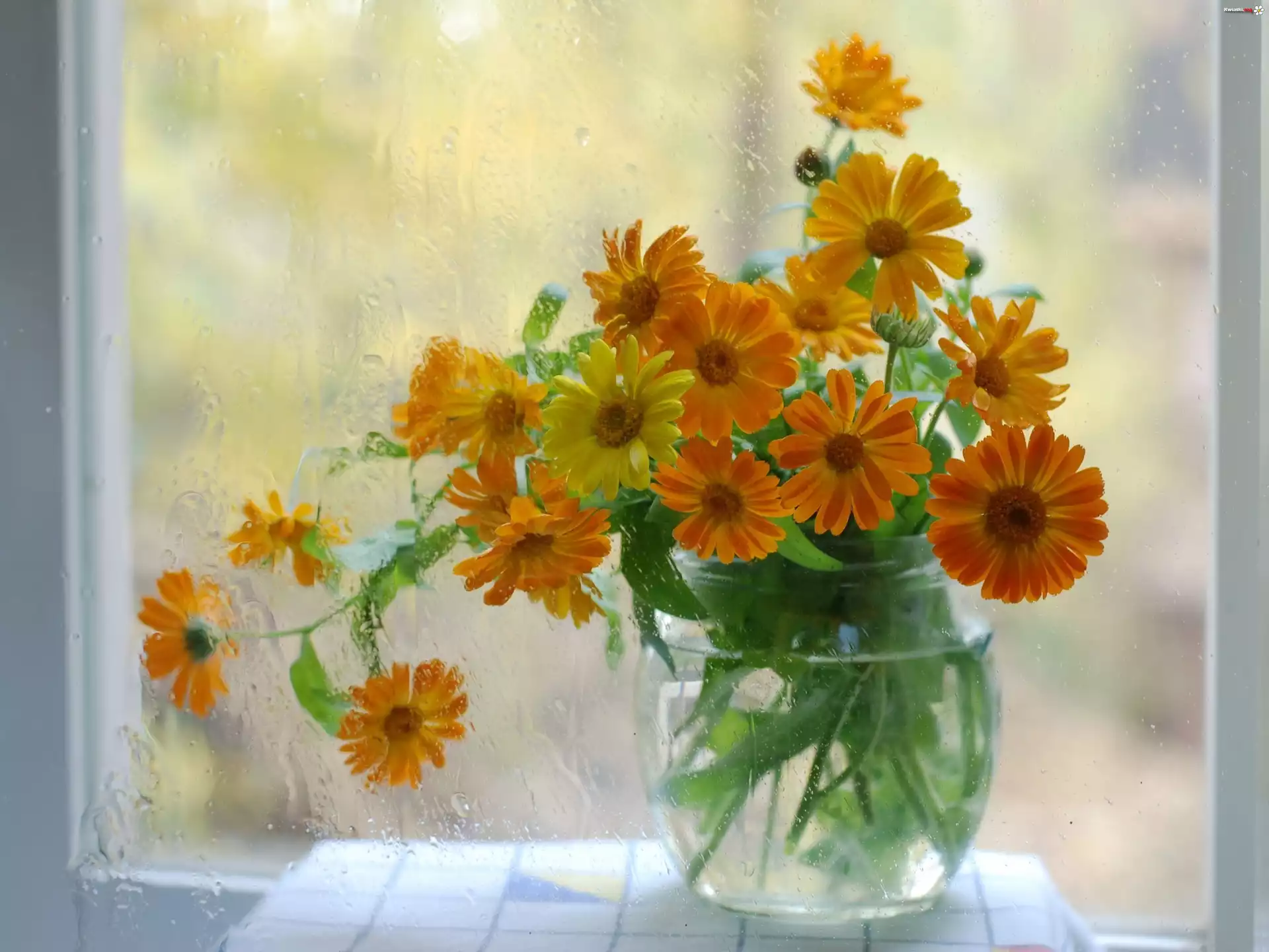 Kwiat Pomarańczowe, Margarytki, Szyba, Deszcz