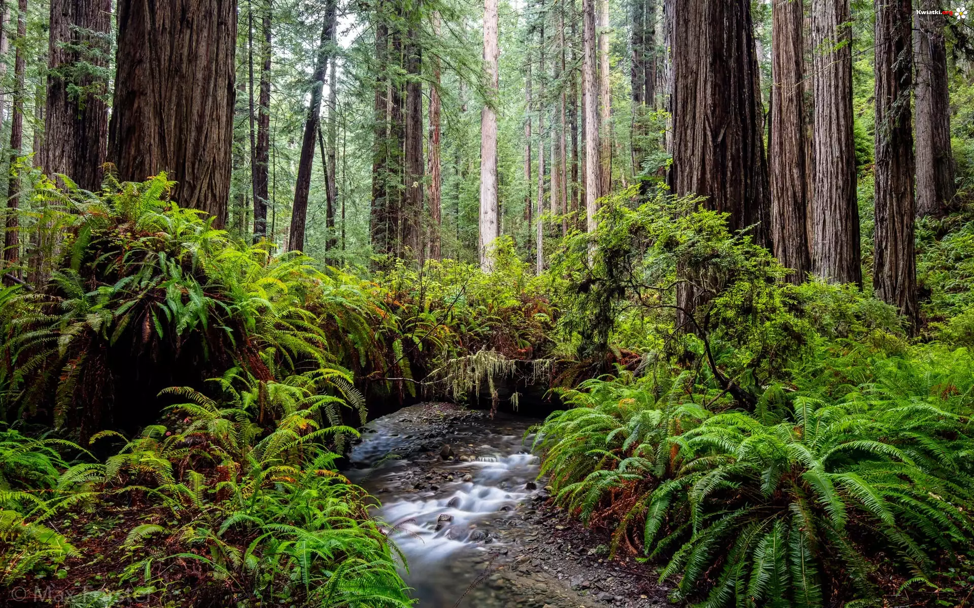 Las, Drzewa, Sekwoje, Paprocie, Park stanowy, Rzeka, Prairie Creek Redwood State Park, Kalifornia, Stany Zjednoczone - Zdjęcia |