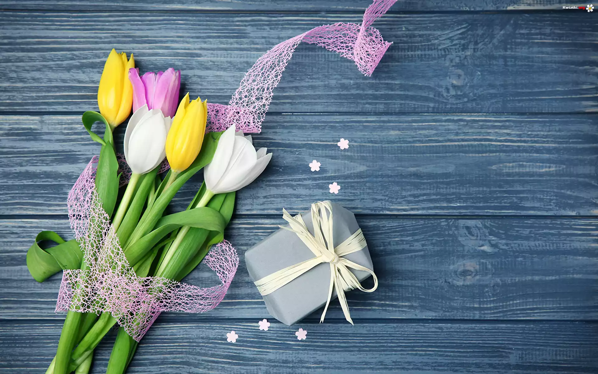 Kwiat Bukiet, Kolorowe, Tulipany, Prezent, Kokardka, Deski