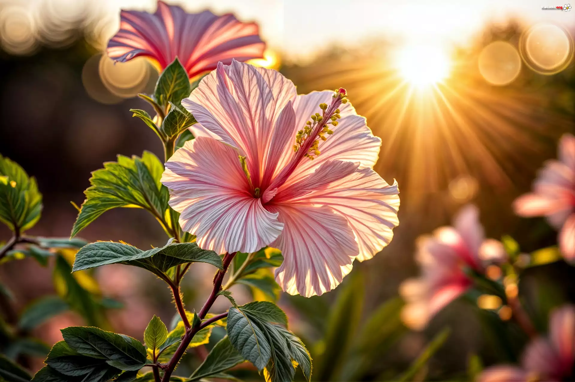 Hibiskus, Kwiat, Liście, Promienie słońca, Grafika - Zdjęcia