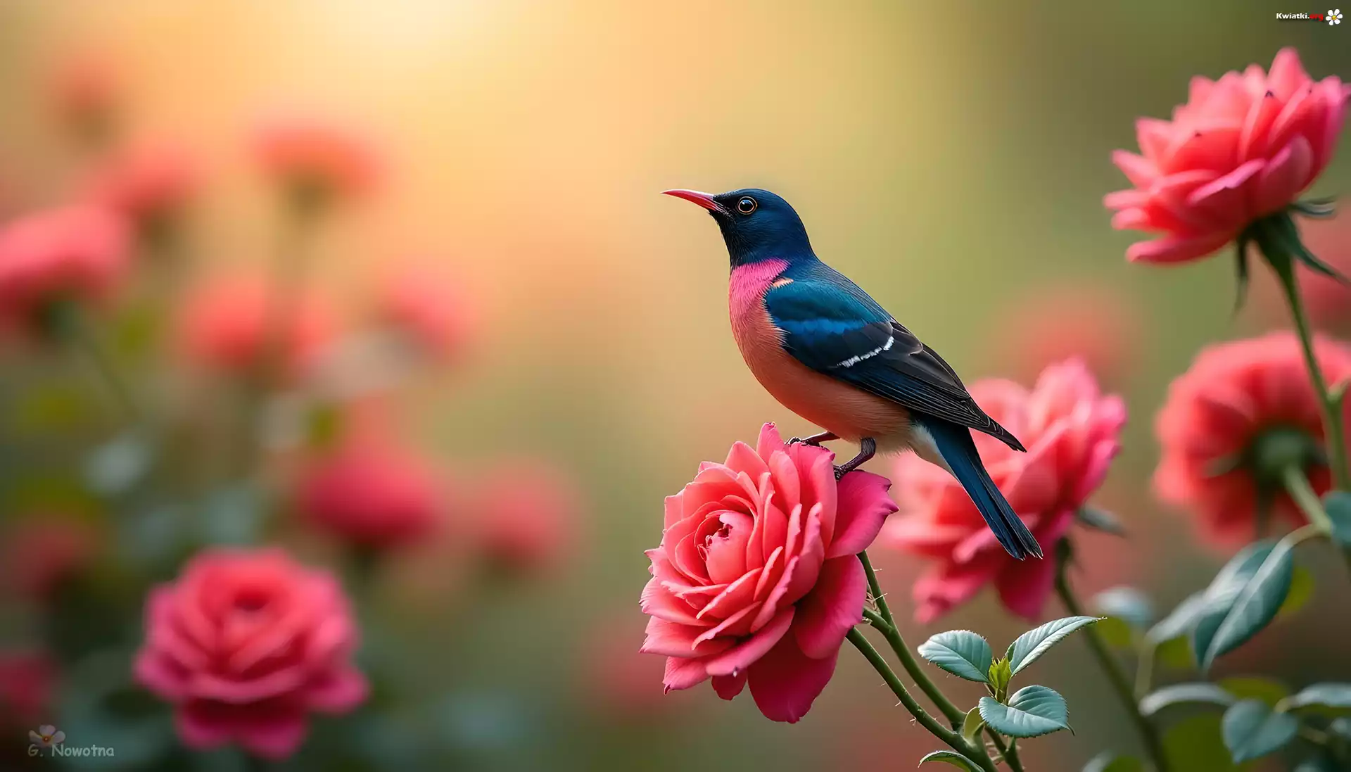 Kolorowy, Ptak, Róże, Kwiaty, Grafika - Zdjęcia