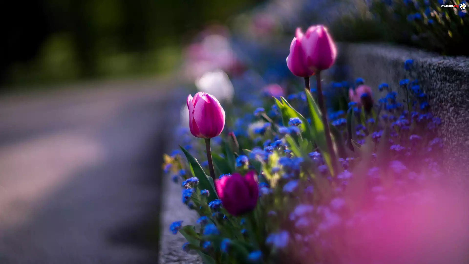 Kwiat Rabatka, Tulipany, Niezapominajki, Rozmyte, Tło, Makro