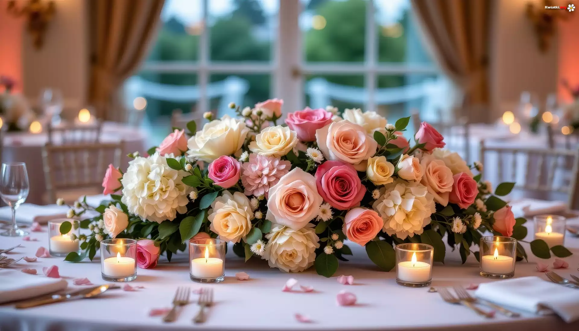Kwiat Kwiaty, Róże, Hortensje, Świece, Stół