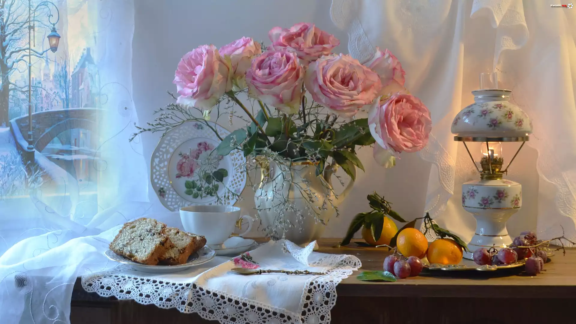 Kwiat Różowe, Róże, Bukiet, Dzbanek, Lampa, Talerze, Ciasto, Owoce
