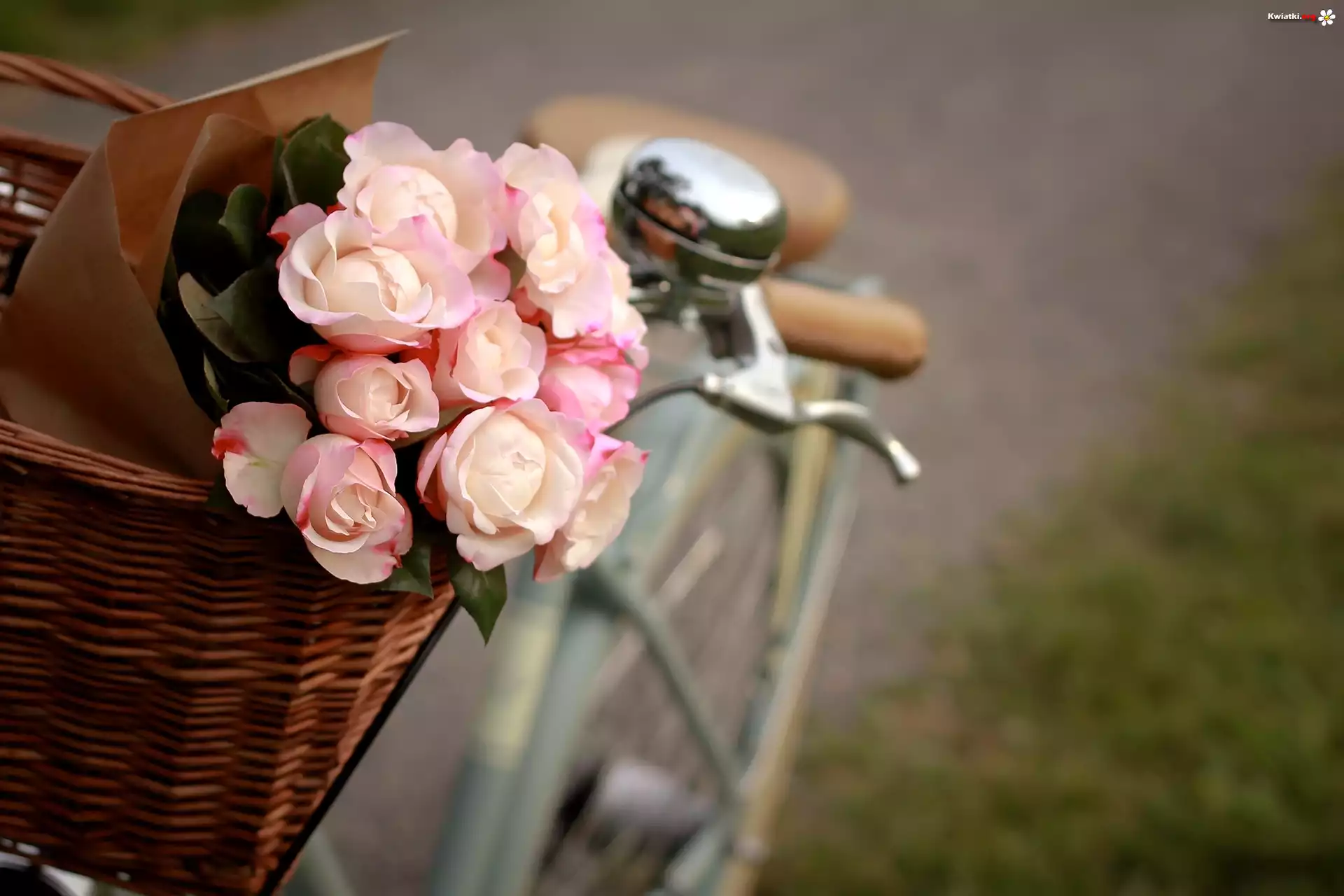 Kwiat Różowe, Róże, Bukiet, Kosz, Rower, Rozmyte, Tło