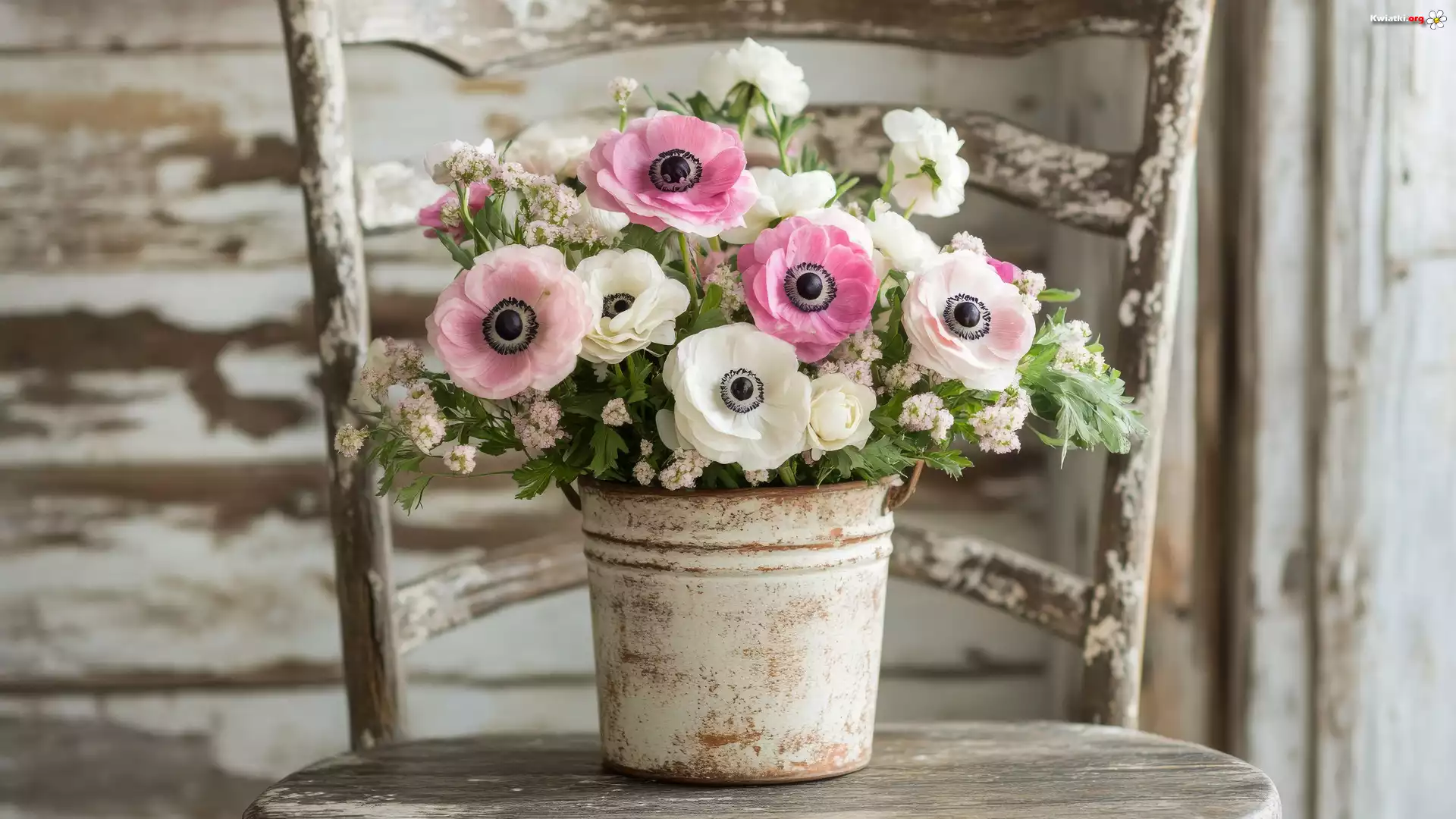 Kwiaty, Zawilce, Białe, Różowe, Bukiet, Wiadro, Krzesło - Zdjęcia