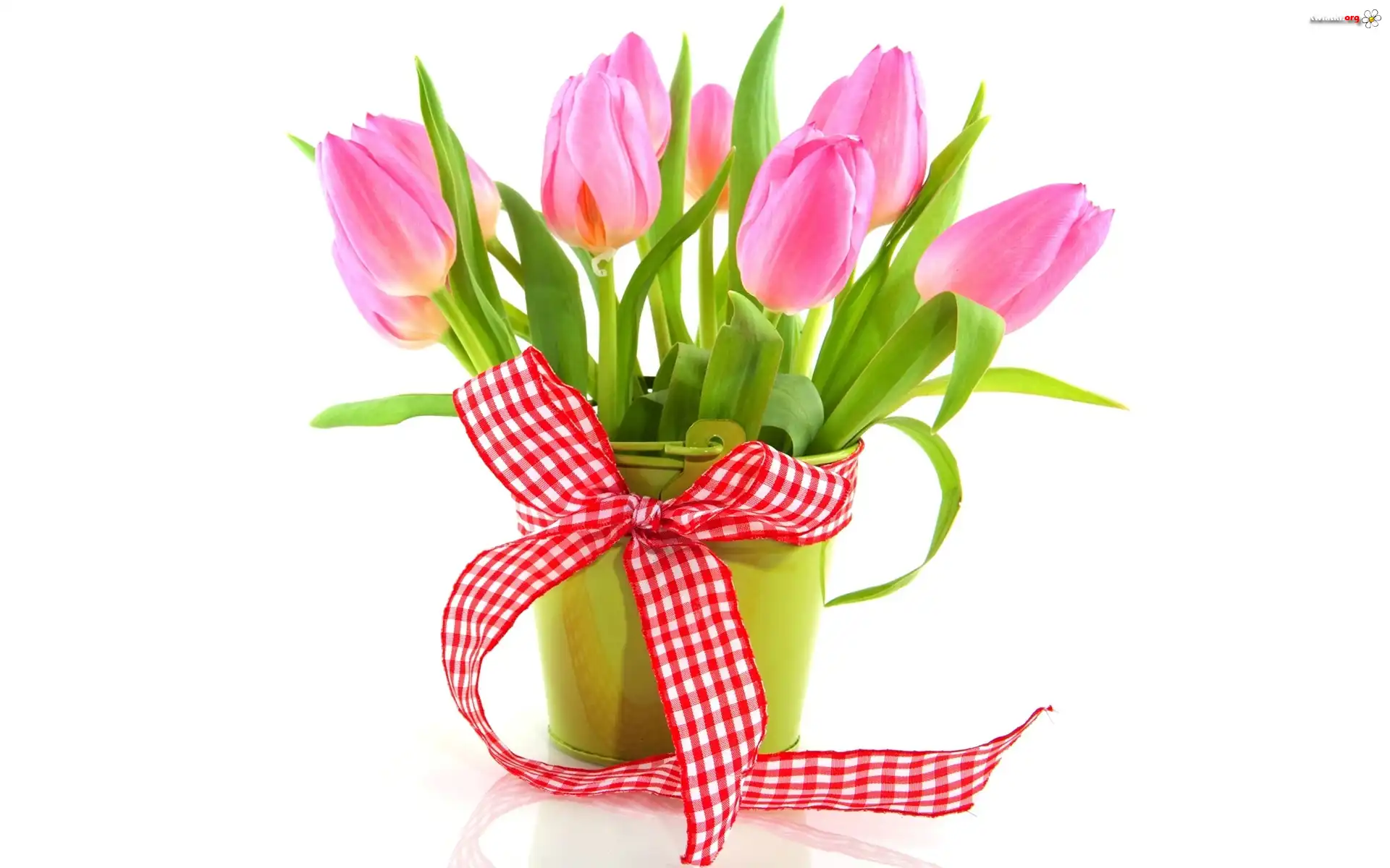 Kwiat Różowe, Tulipany, Wiaderko, Kokarda, Kratka