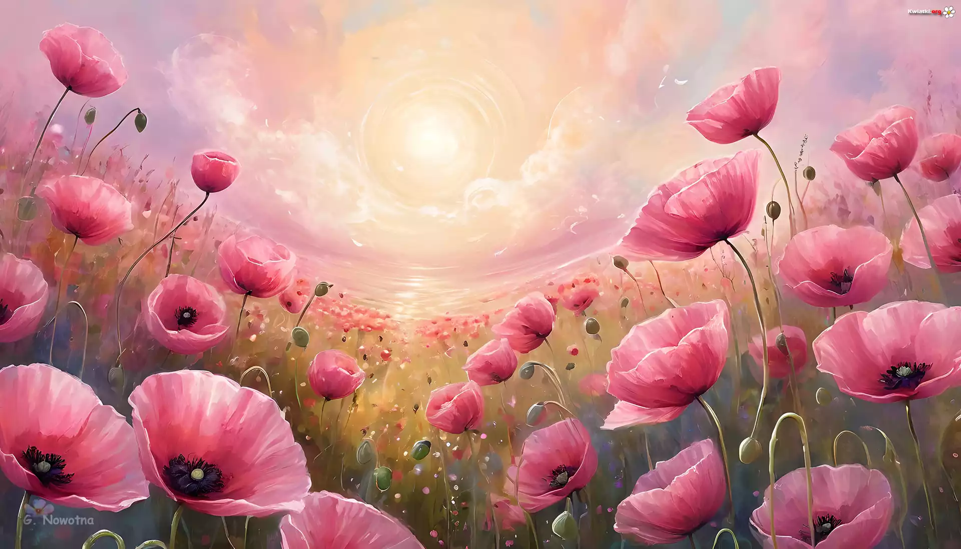 Słońce, Różowe, Maki, Kwiaty, Grafika - Zdjęcia