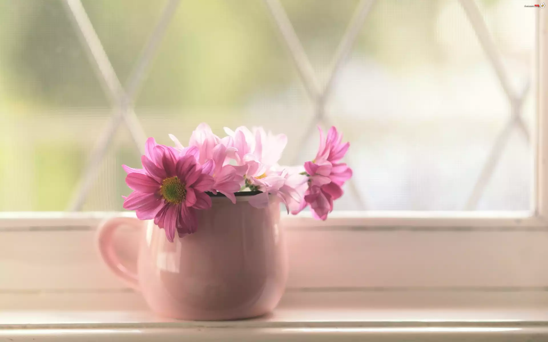 Kwiat Różowe, Kwiaty, Parapet, Wazonik