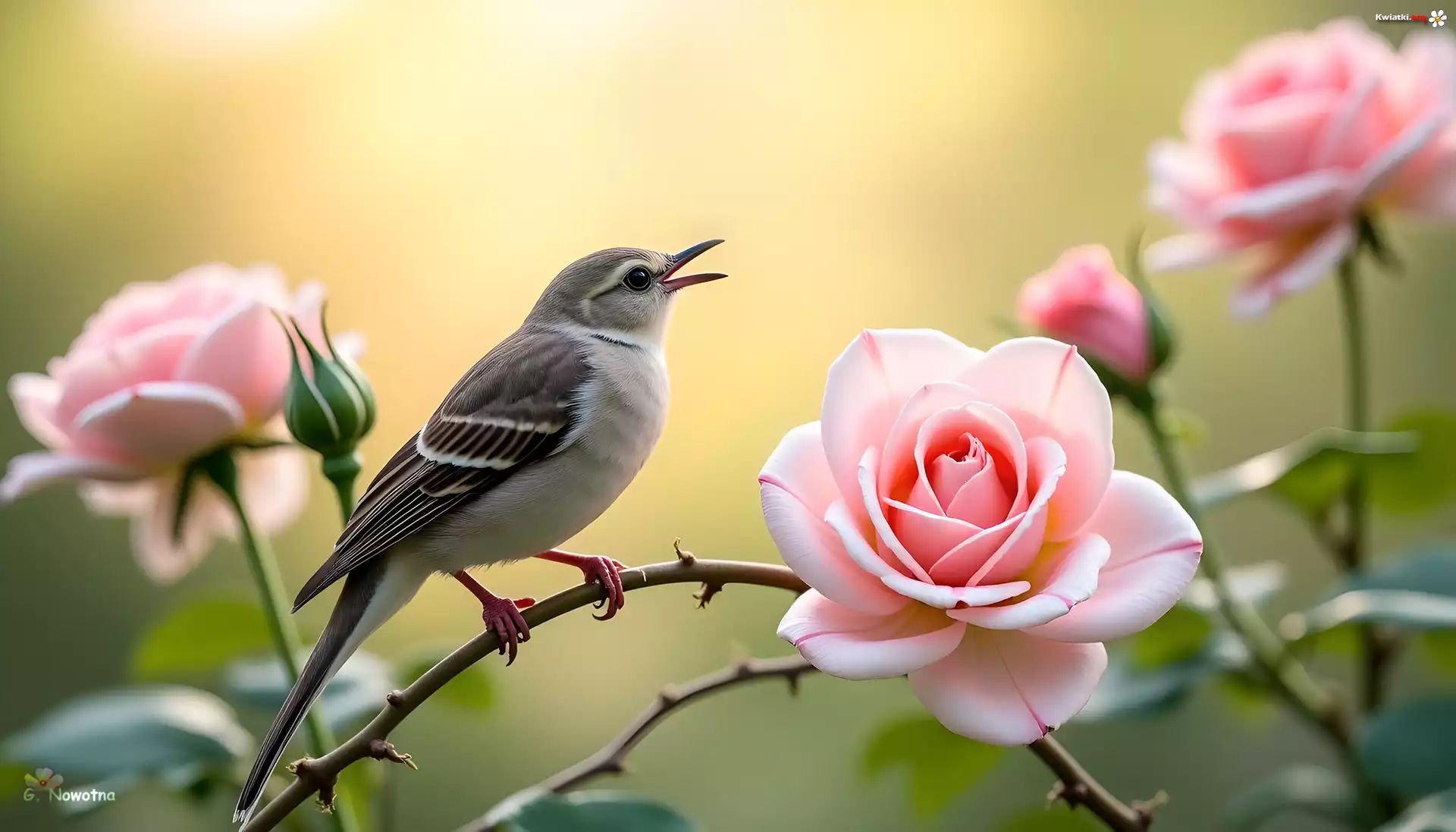 Ptak, Różowe, Róże, Grafika AI - Zdjęcia