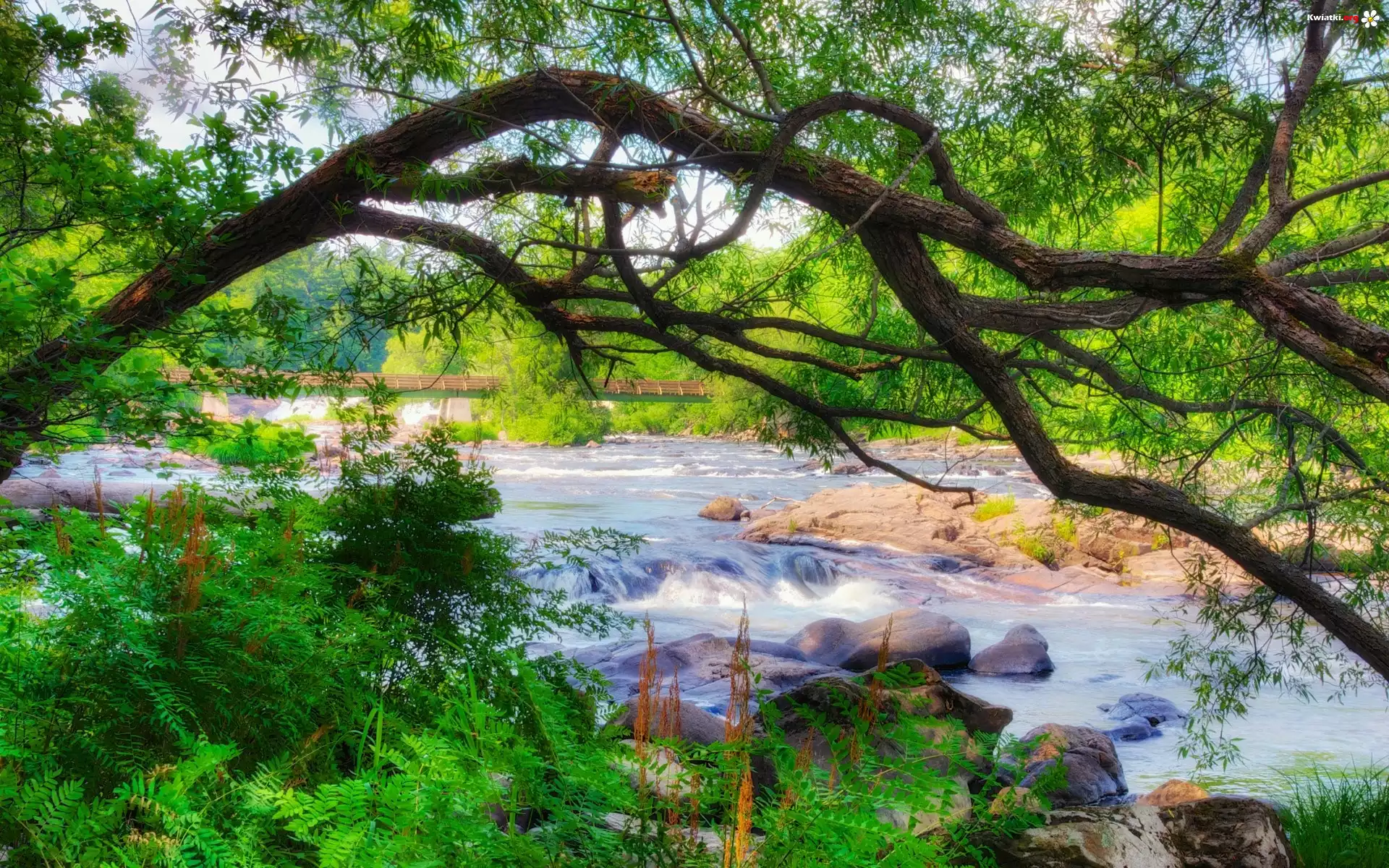 Rzeka, Kamienie, Paprocie, Most, Wiosna - Zdjęcia
