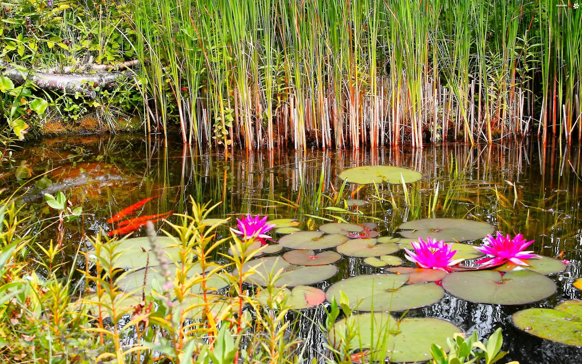 Rzeka, Lilie, Wodne, Trawy - Zdjęcia