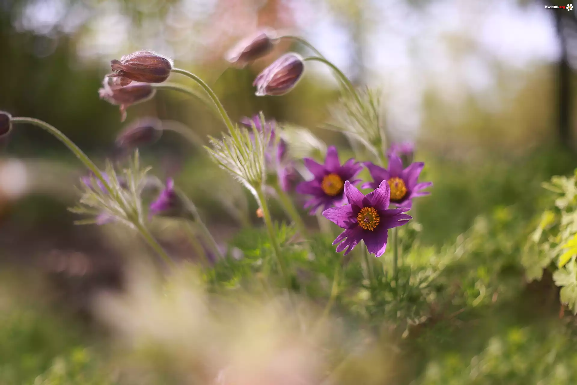 Fioletowe, Sasanki, Kwiaty, Rozmyte tło - Zdjęcia