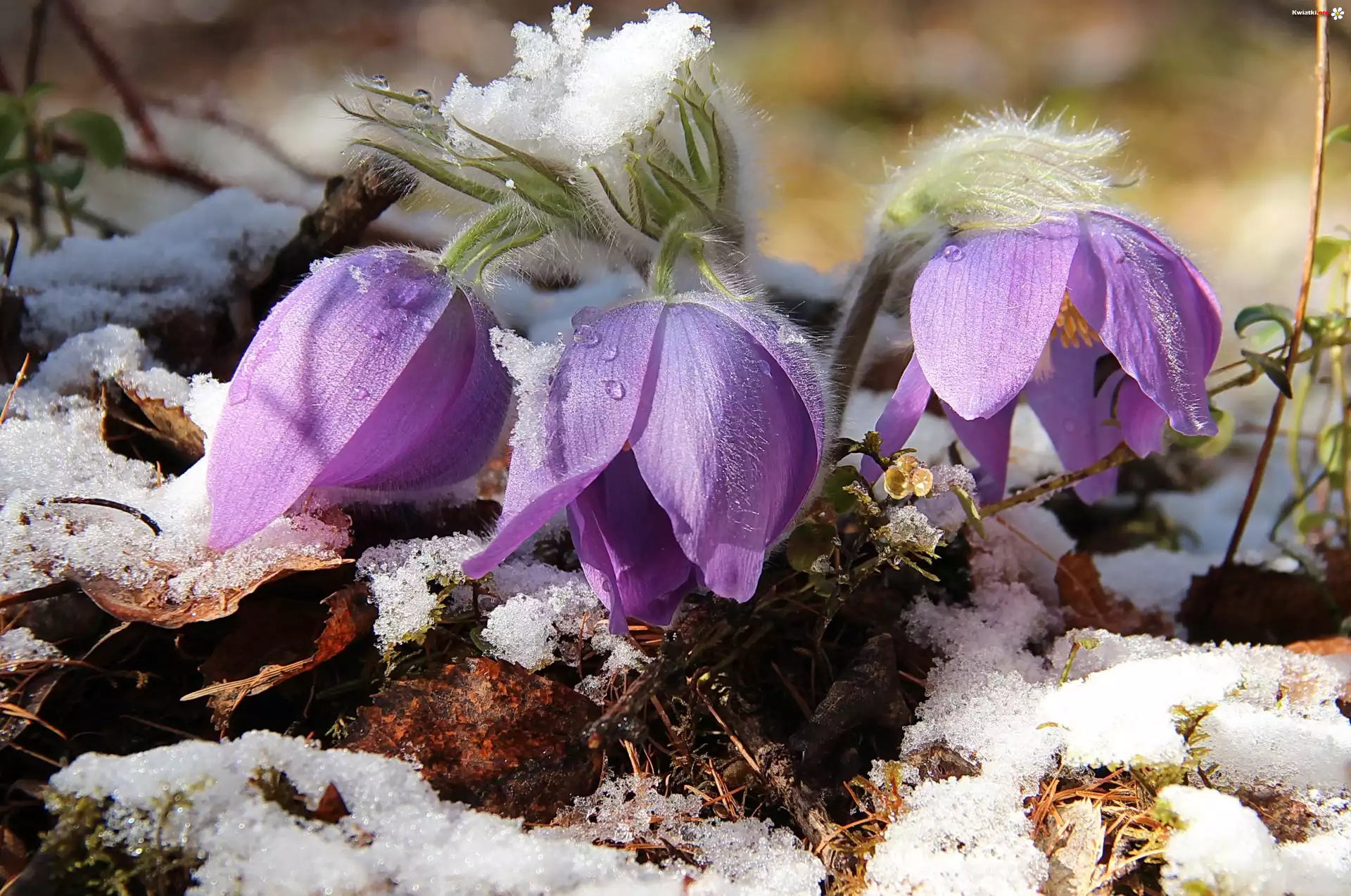 Kwiat Sasanki, Łąka, Śnieg, Wiosna