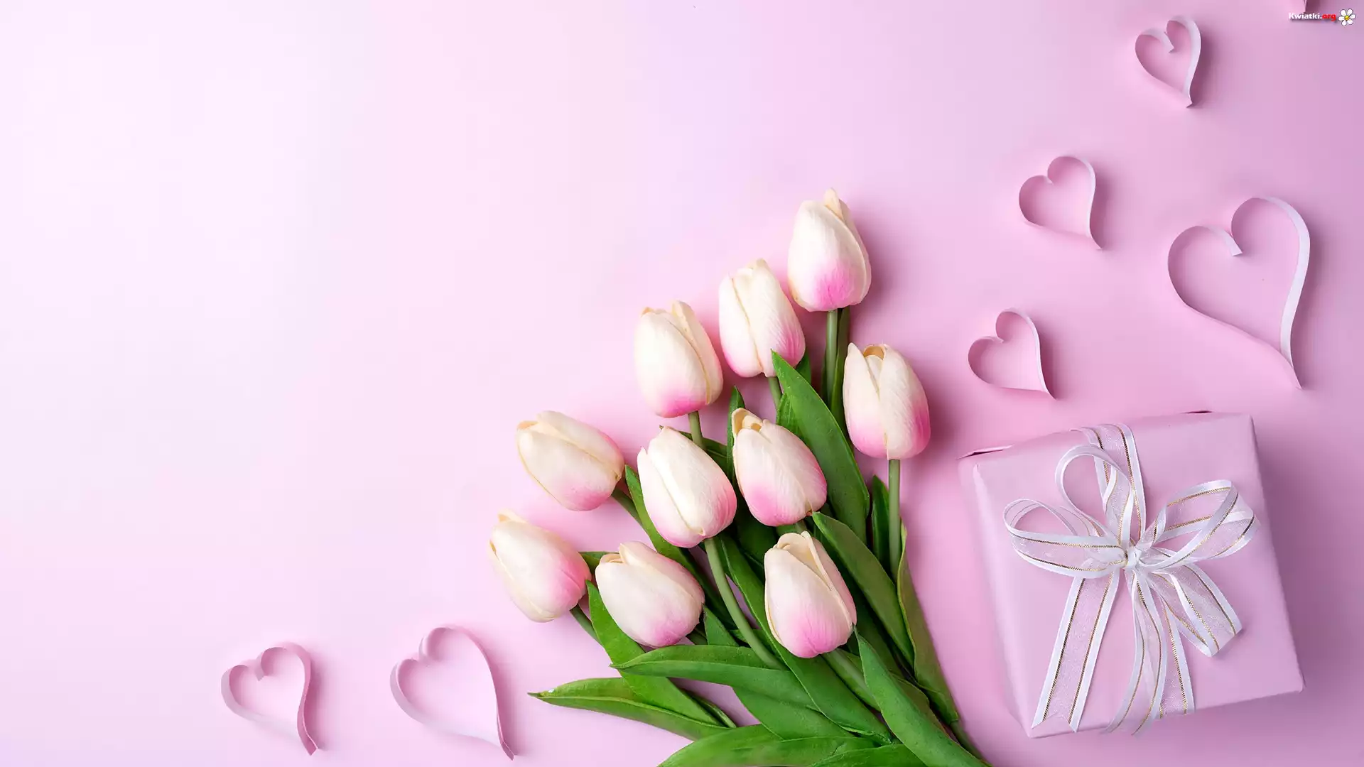 Kwiat Serduszka, Kwiaty, Tulipany, Prezent, Różowe tło