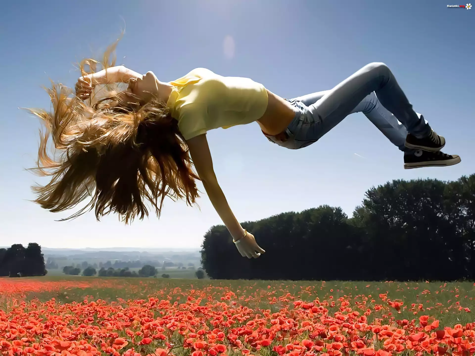 Skok, Radość, Łąka, Kwiaty, Kobieta - Zdjęcia