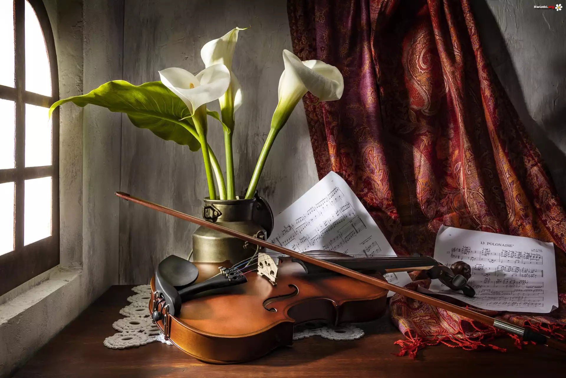 Kwiaty, Kalie, Dzbanek, Skrzypce, Nuty, Okno, Kompozycja - Zdjęcia