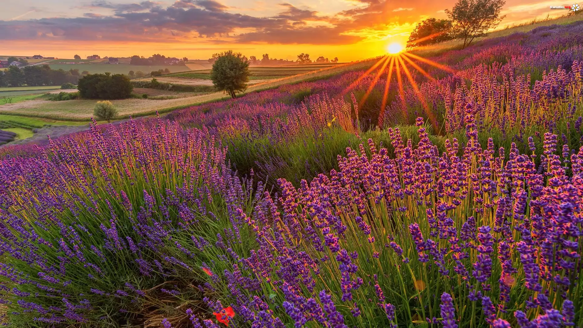 Kwiat Pole, Lawenda, Promienie słońca, Drzewa, Wzgórze