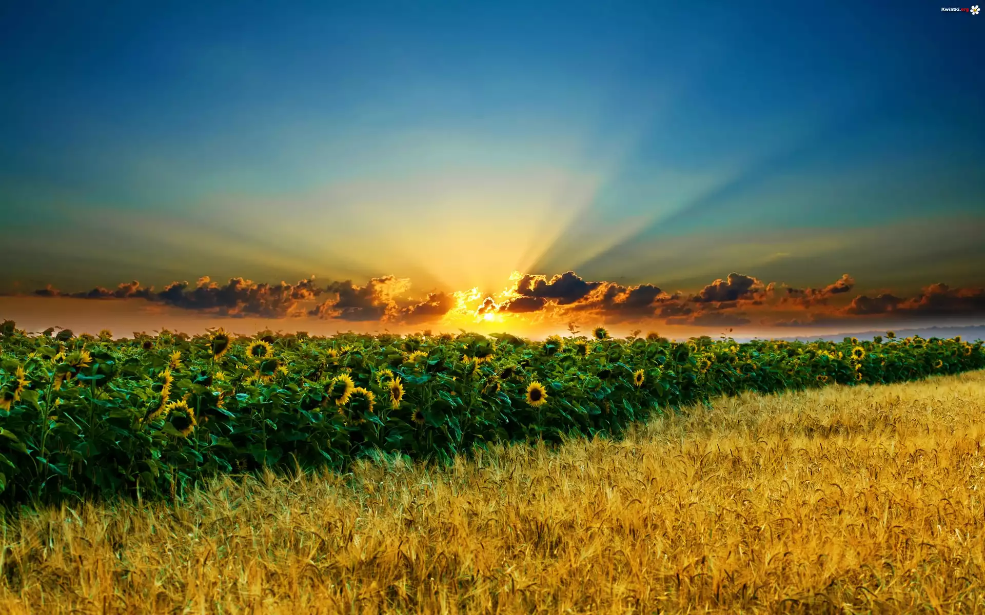Słoneczniki, Zboże, Lato, Zachód słońca - Zdjęcia