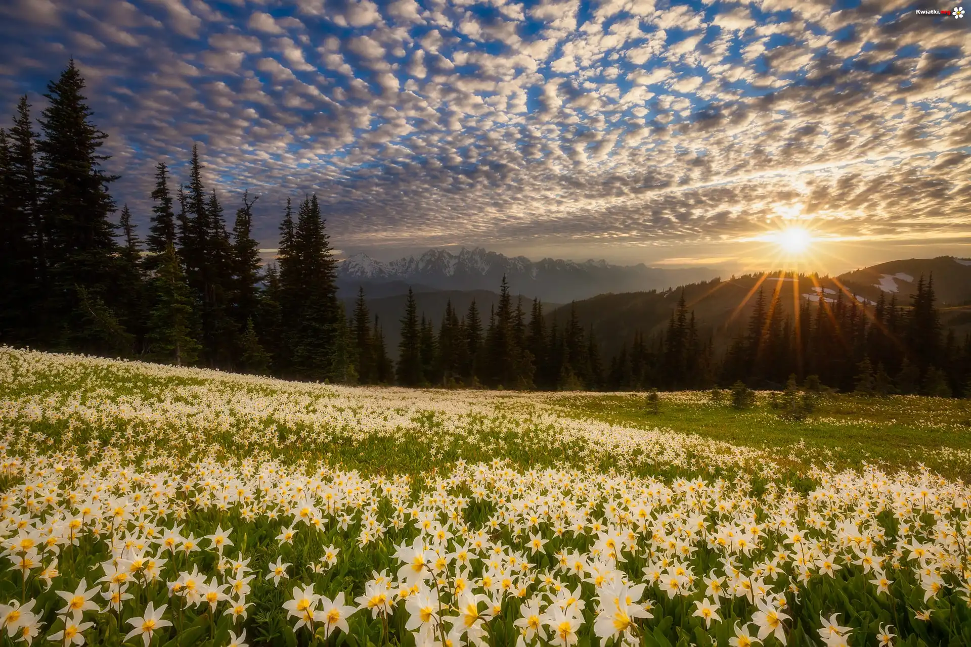 Łąka, Kwiaty, Psizęby, Las, Góry, Promienie słońca, Park Narodowy Olympic, Stan Waszyngton, Stany Zjednoczone - Zdjęcia |