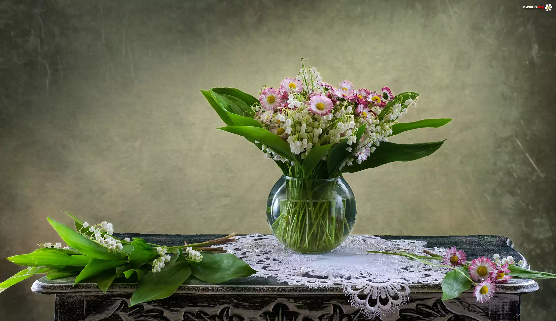 Kwiat Kwiaty, Stokrotki, Konwalie, Bukiet, Wazon, Stolik, Serweta