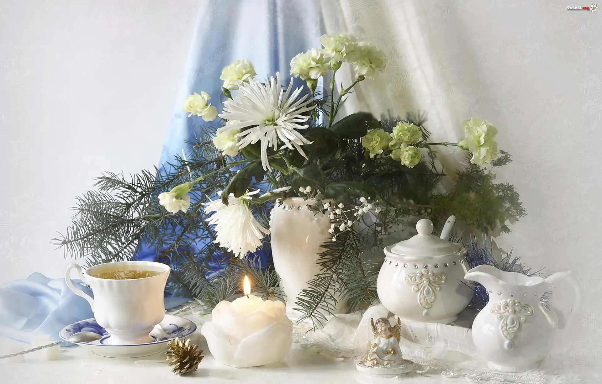 Kompozycja, Zastawa, Stołowa, Kwiaty, Goździki, Astry, Świeczka, Bukiet - Zdjęcia