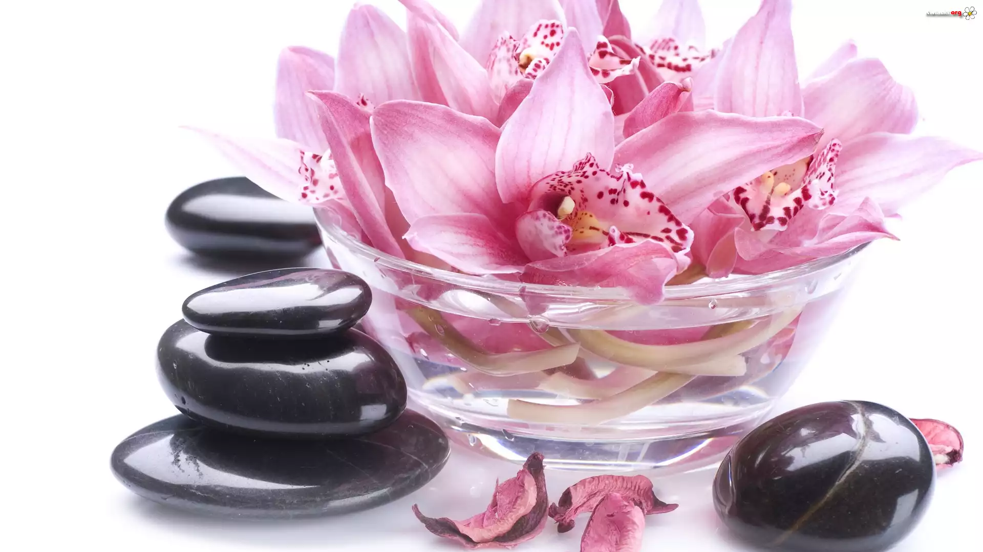 Szklane, Naczynie, Kwiaty, Storczyki, Czarne, Kamienie - Zdjęcia