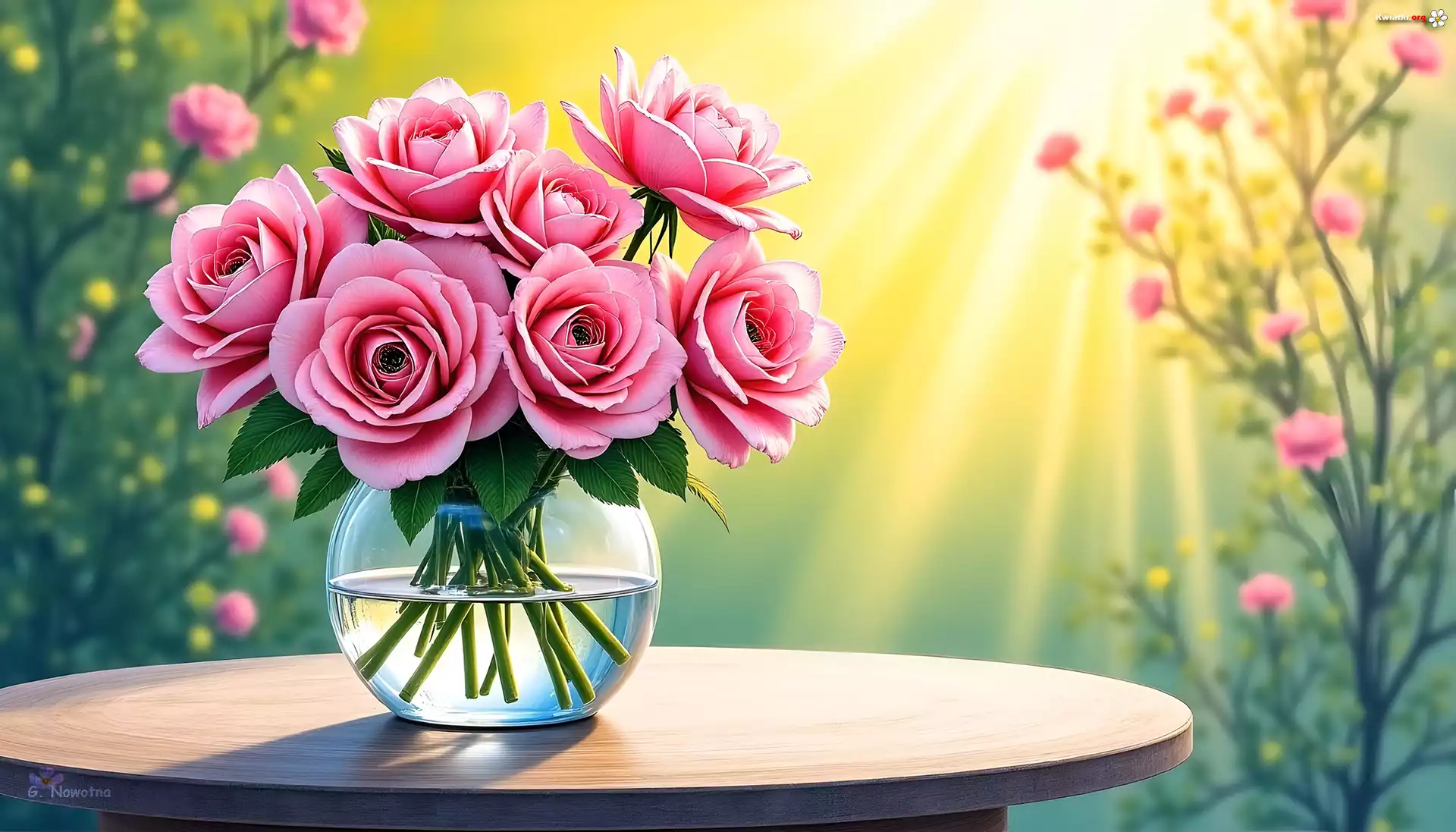 Róże, Szklany, Wazon, Stolik, Grafika - Zdjęcia