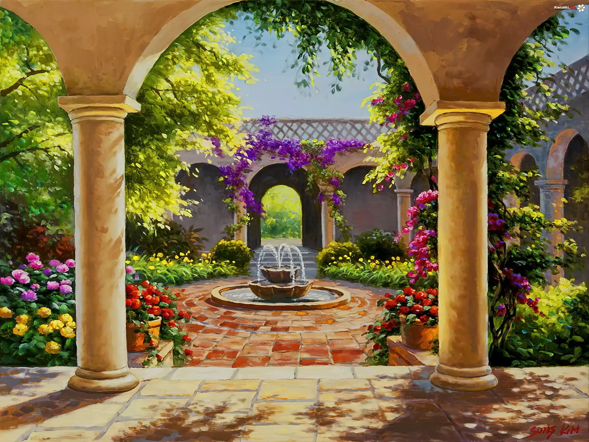 Kwiat Taras, Ogród, Fontanna, Kwiaty