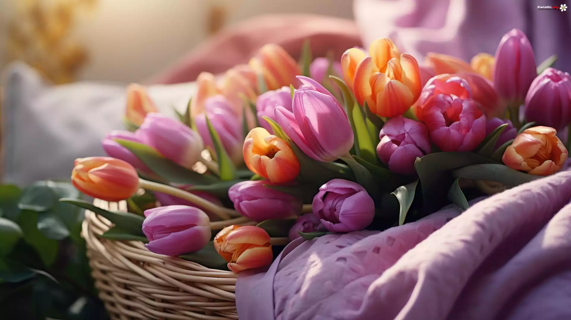 Kwiat Kolorowe, Tulipany, Kosz, Tkanina