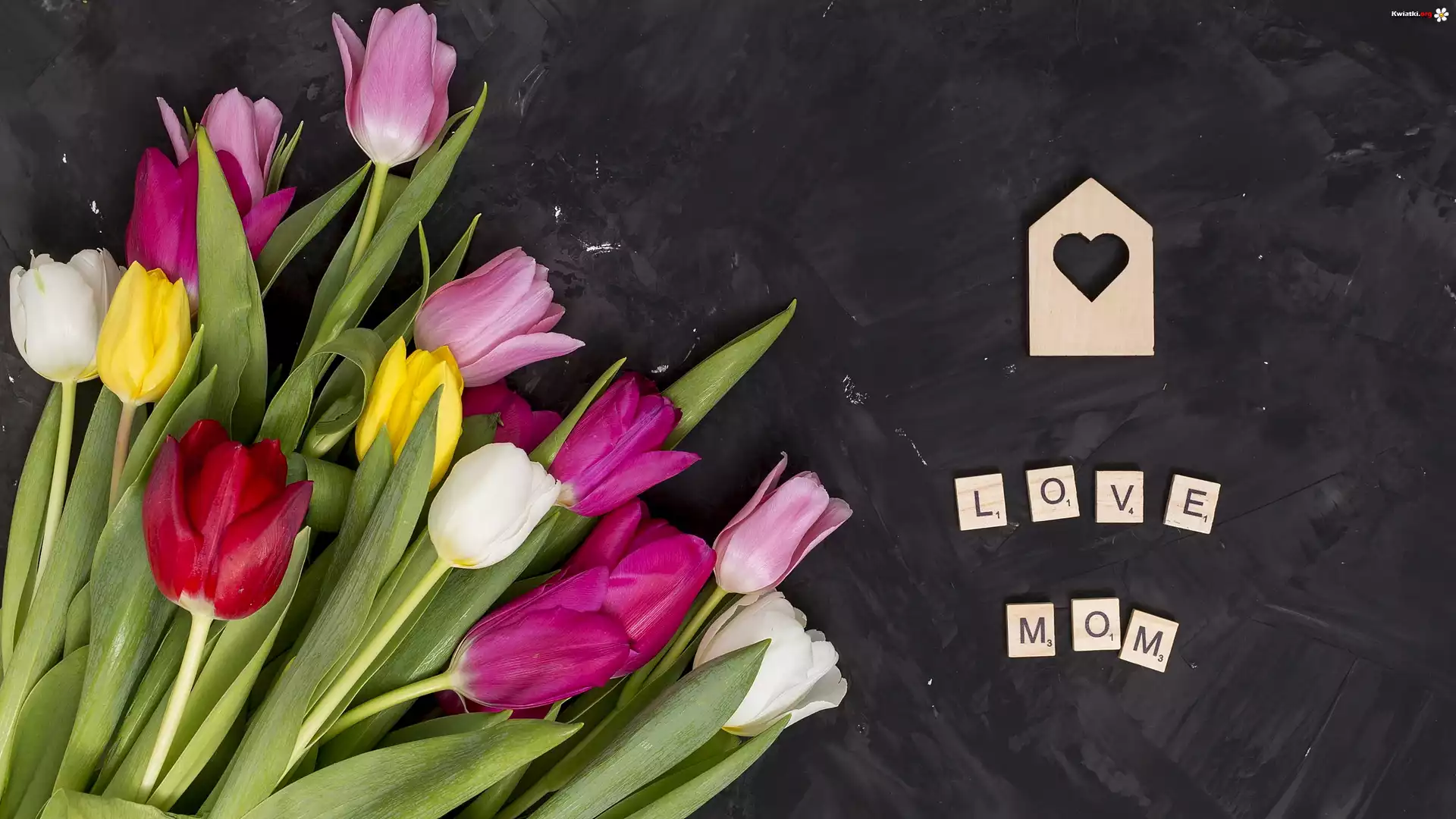 Kwiat Dzień Matki, Napis, Love Mom, Kolorowe, Tulipany, Ciemne, Tło
