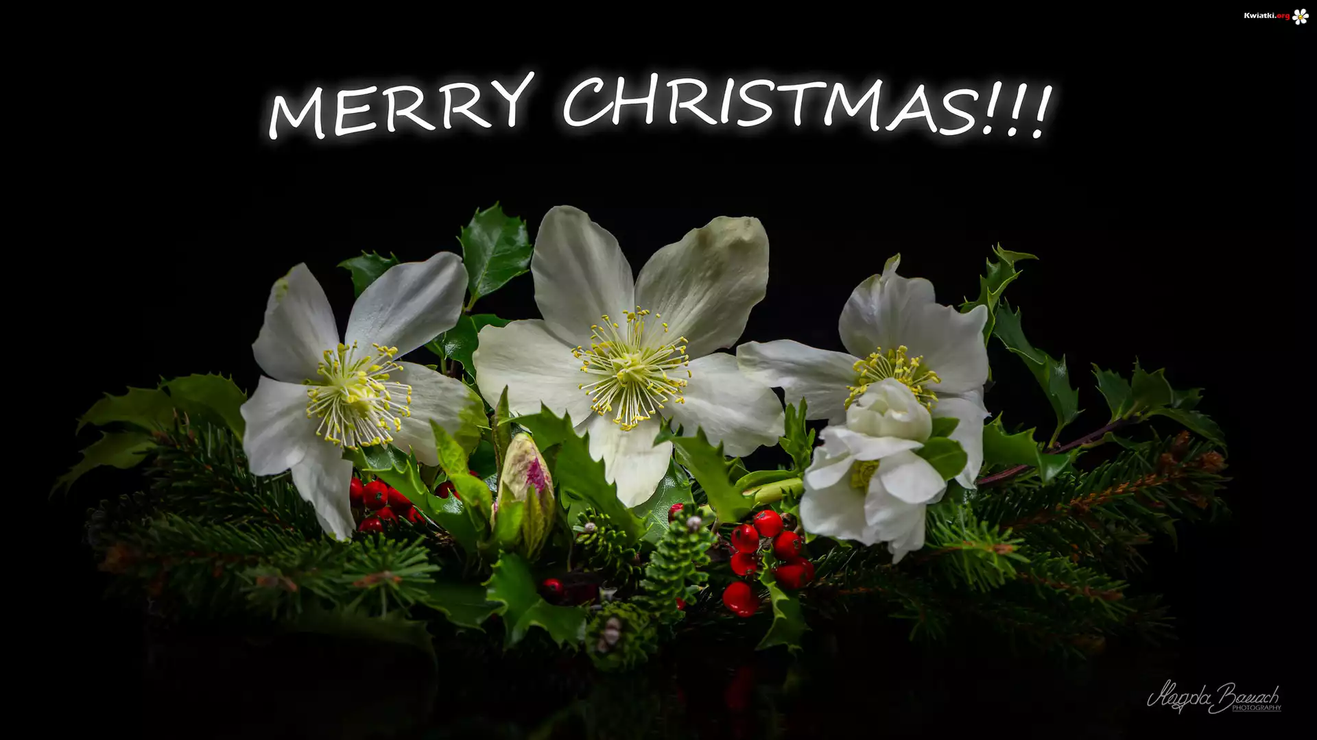 Kwiat Boże Narodzenie, Stroik, Kwiaty, Ciemierniki, Gałązki, Napis, Czarne tło