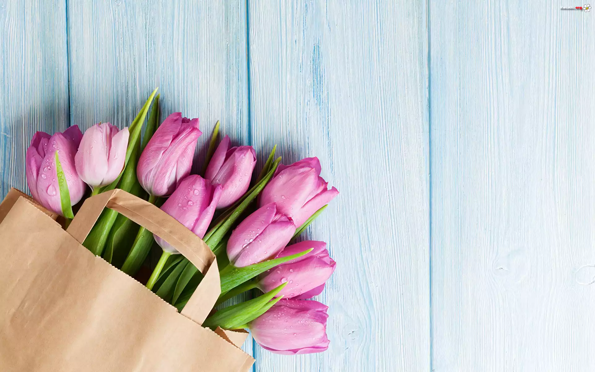 Kwiat Kwiaty, Jasnofioletowe, Tulipany, Torba papierowa, Błękitne, Deski