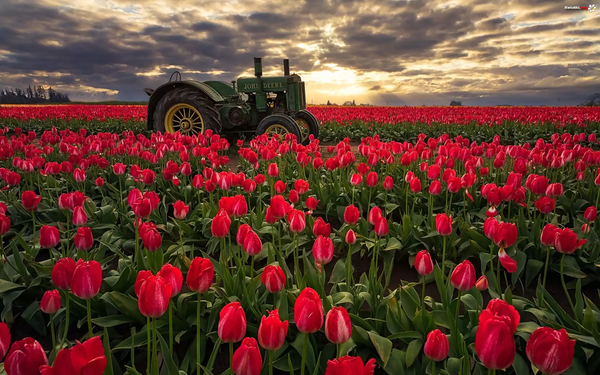 Pole, Tulipany, Traktor, Wschód słońca, Hrabstwo Clackamas, Stan Oregon, Stany Zjednoczone - Zdjęcia |