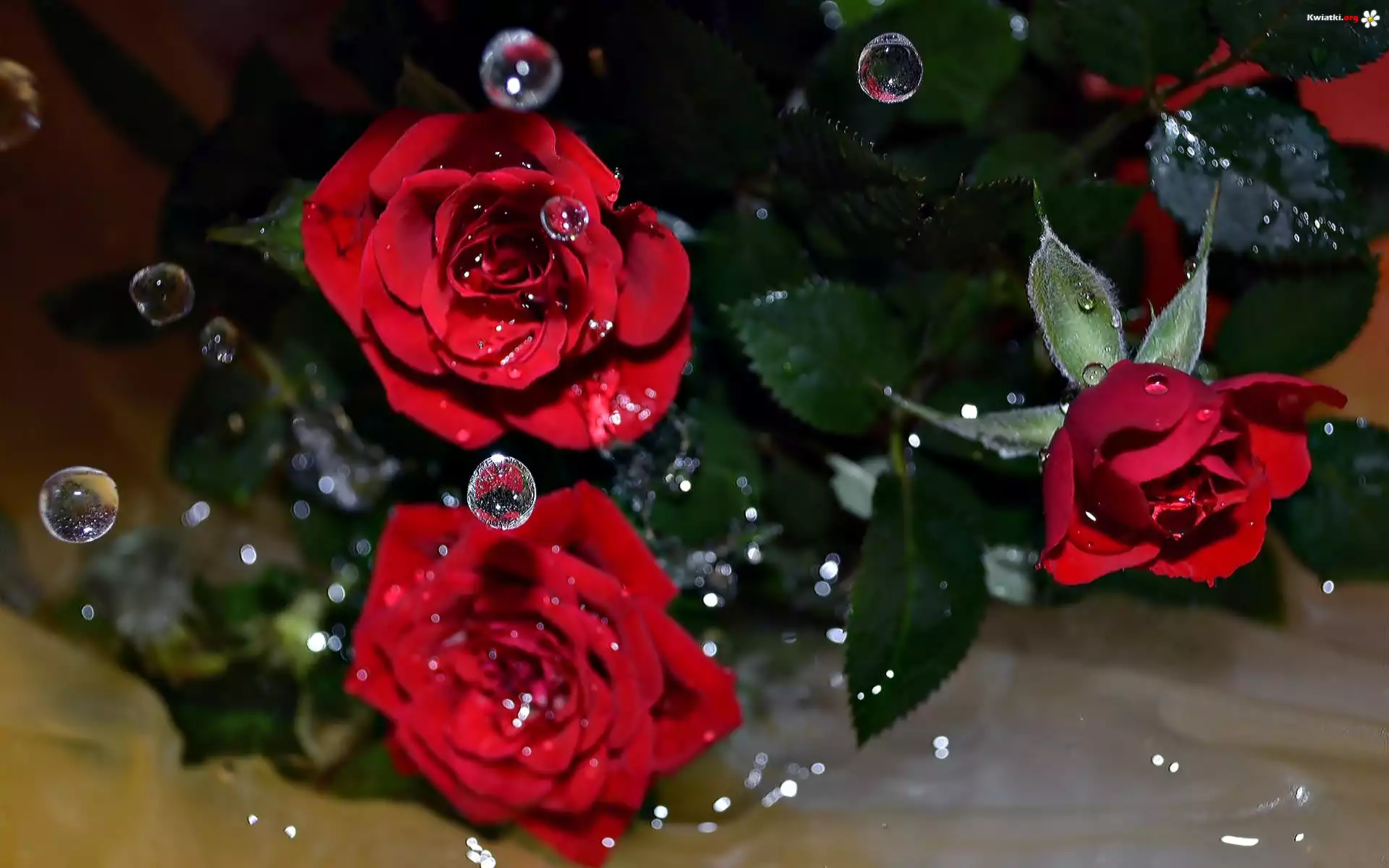Kwiat Trzy, Czerwone, Róże, Krople, Wody