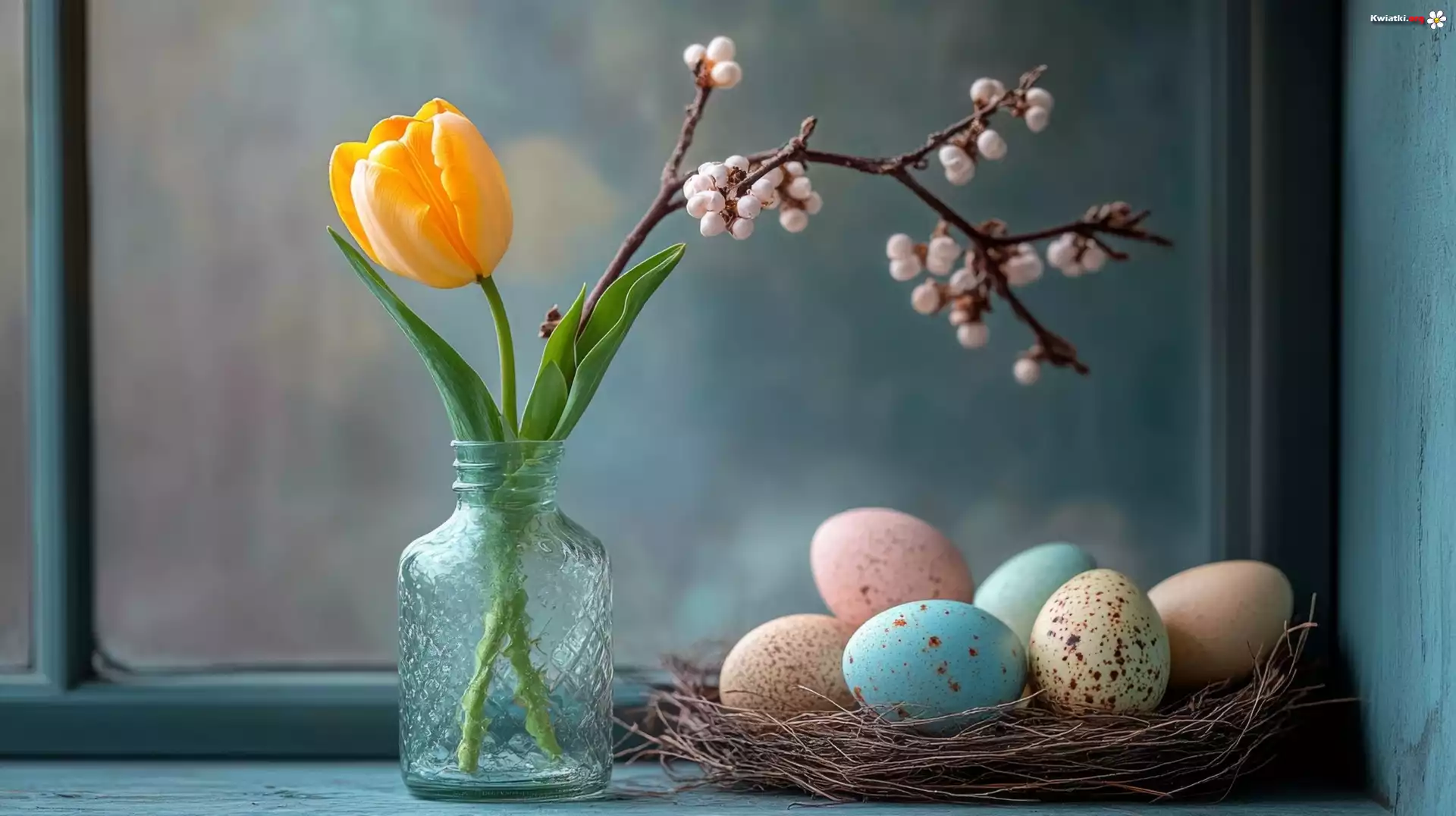 Kwiat Wielkanoc, Pisanki, Gniazdko, Tulipan, Gałazka, Słoik