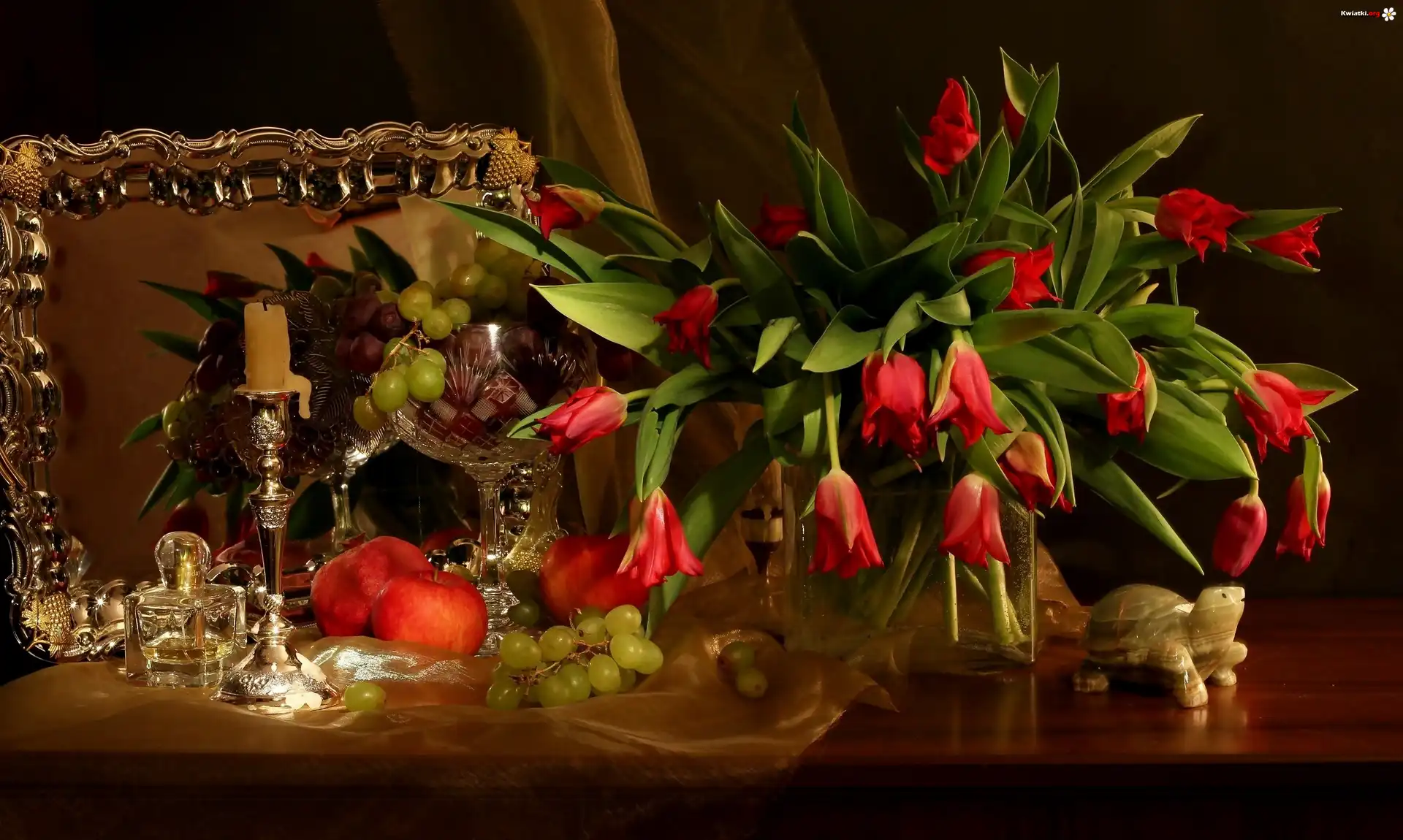 Bukiet, Tulipany, Flakon, Winogrona, Jabłka, Lustro, Świeca - Zdjęcia