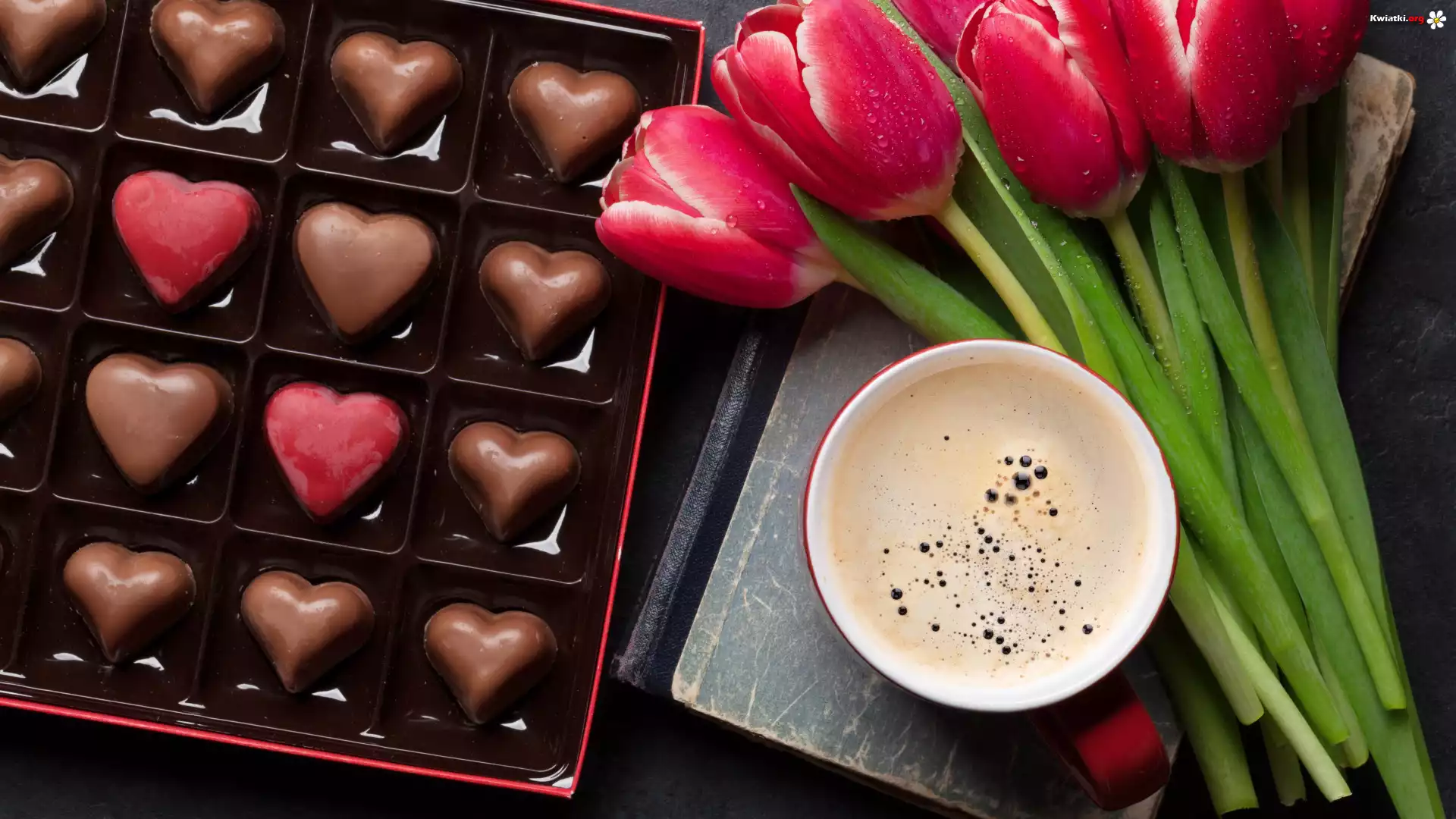 Bukiet, Tulipany, Filiżanka, Kawa, Pralinki - Zdjęcia