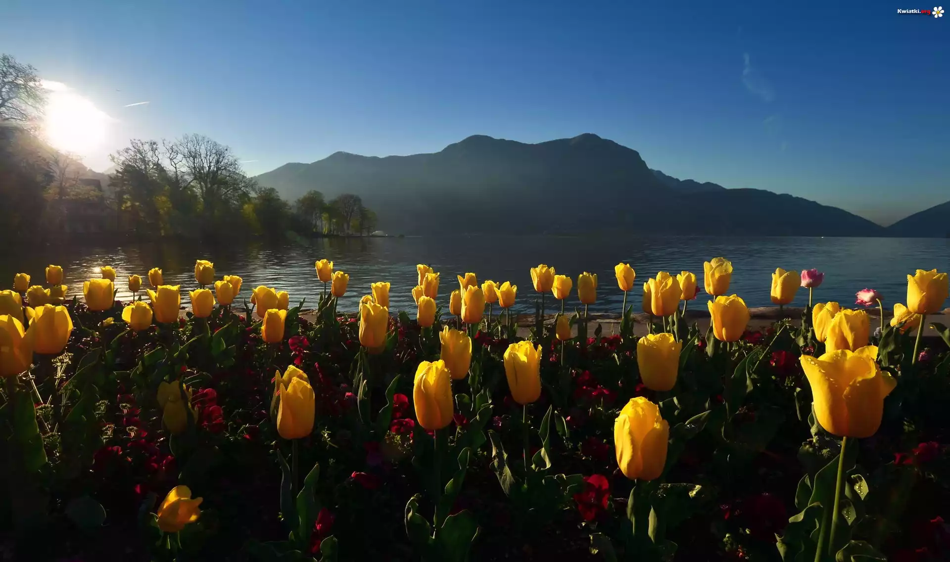 Tulipany, Jezioro, Góry, Poranek - Zdjęcia