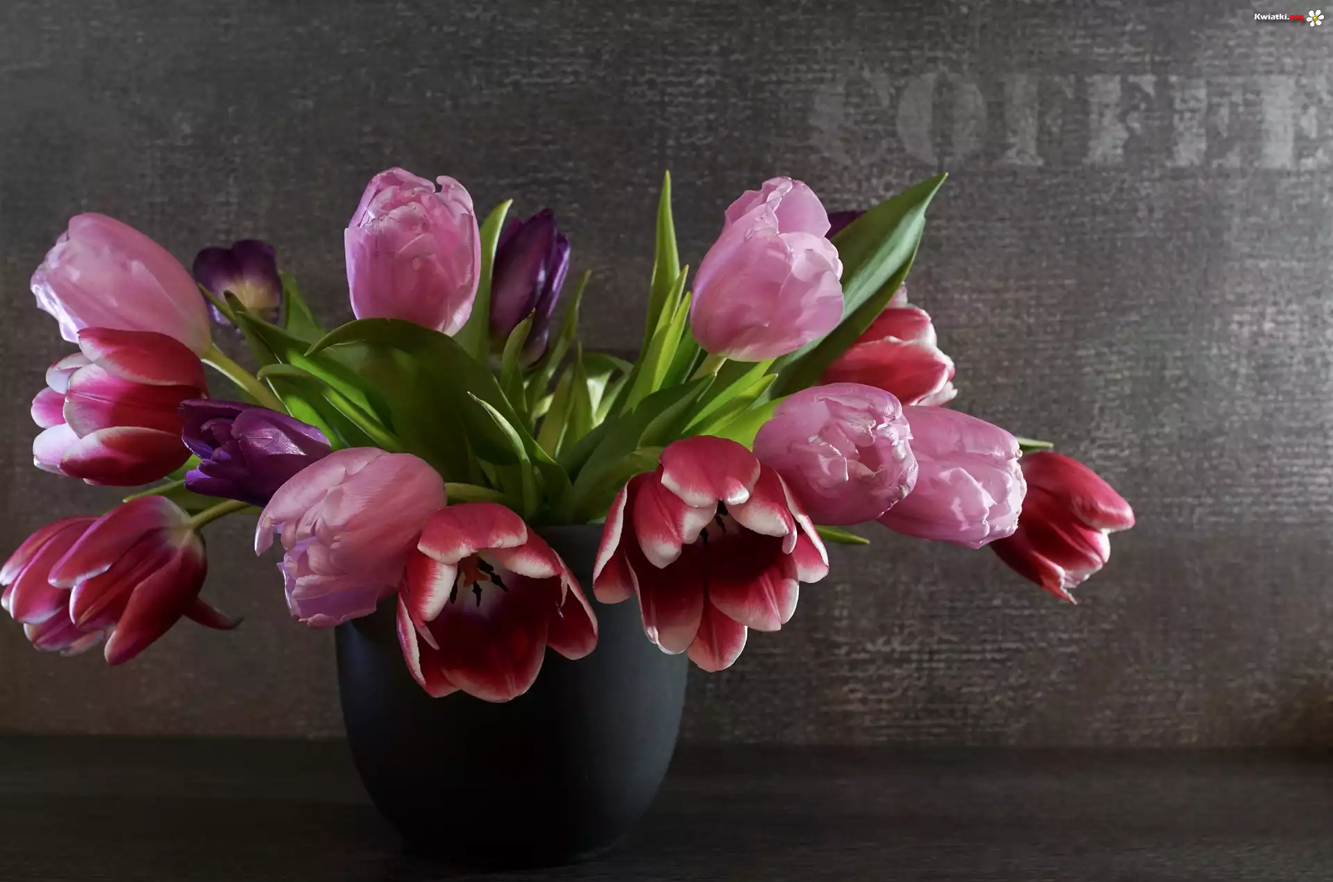 Kwiat Kwiaty, Tulipany, Bukiet, Ciemne tło, Napis, Wazon