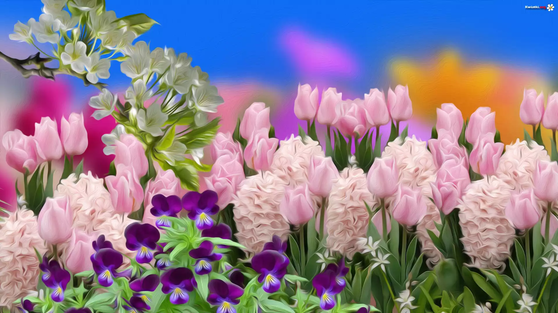 Kwiaty, Tulipany, Hiacynty, Bratki, Gałązka, Grafika, Wiosna - Zdjęcia